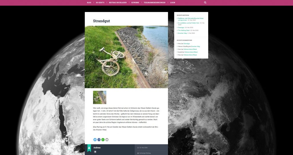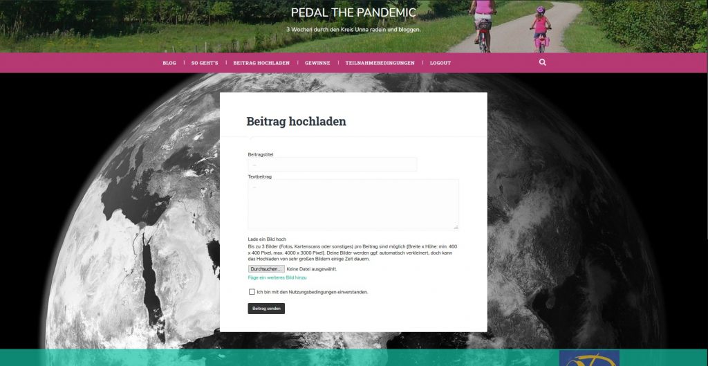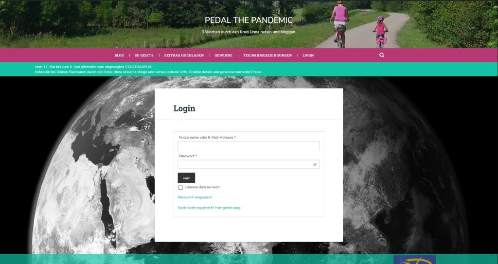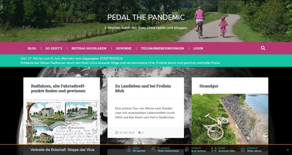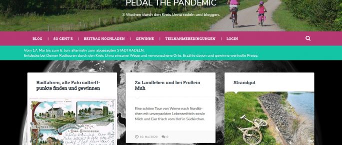 Aktion ‘Pedal the pandemic’ Responsive Site zu Radfahr-Wettbewerb während Corona-Pandemie in Blogform im Masonrystil mit Anmelde- und Hochladefunktion. Startseite (Ausschnitt oben) Unterseite ‘Login’ für Teilnehmer (Ausschnitt, verkleinert) Unterseite ‘Beitrag hochladen’ für Teilnehmer (Ausschnitt, verkleinert) Beispiel Blogbeitrag (Ausschnitt, verkleinert)